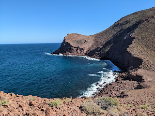 Don't be deceived by this pretty view. Wear hiking boots or at least closed-toe shoes on the "trail" connecting Bahía Bonanza with Bahía de San Gabriel. Instead of a path, it's mostly a floor of hitchhiking spikes. And instead of trail markers, there's just spikes. Plant life? All spikes. Our first attempt was in sandals. It was unsuccessful and a little bloody. Everything on this path wanted to kill us.